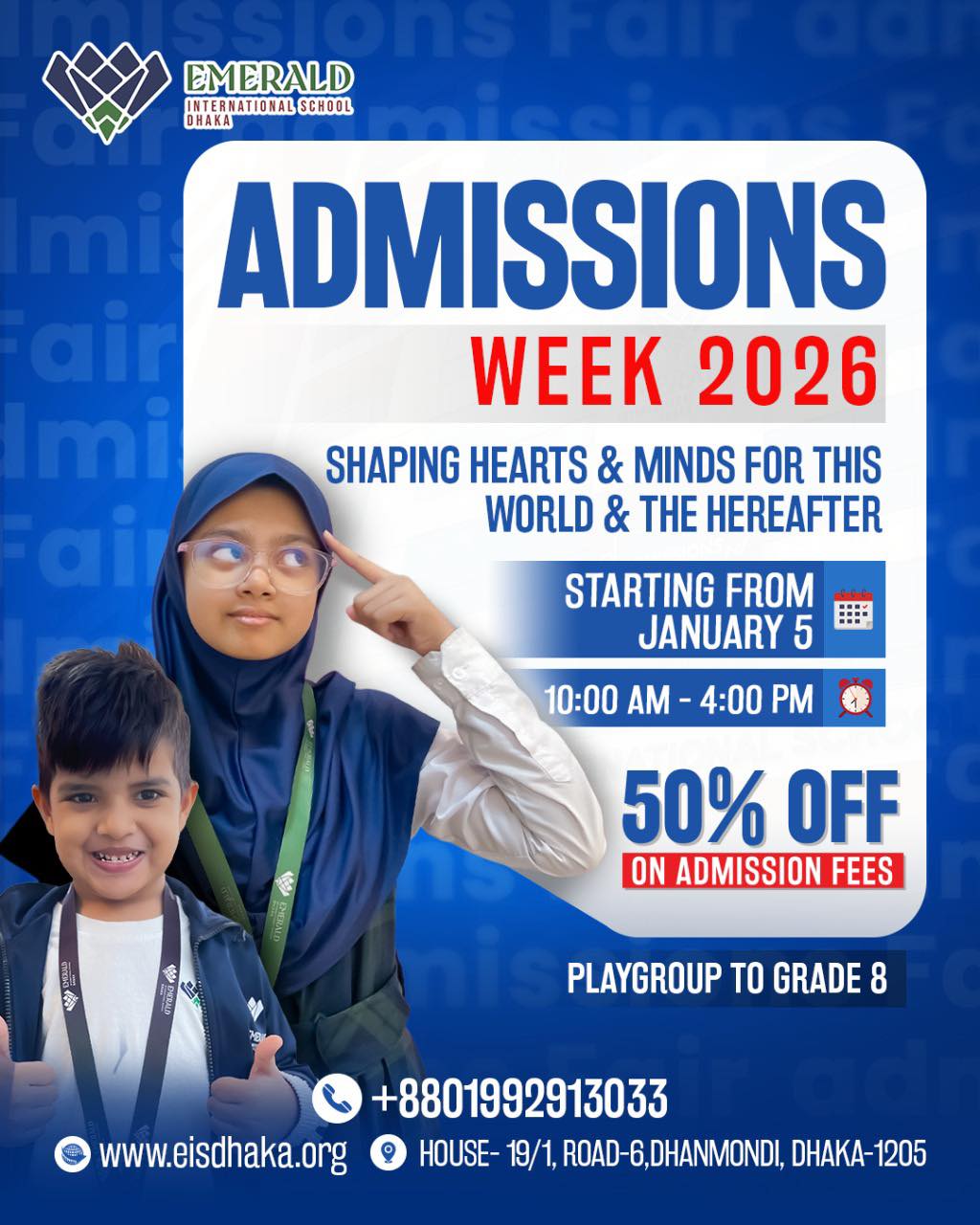 Missed the Spot Admissions Day 2025? Donโt worry! Emerald International School Dhaka is hosting ๐๐๐ฆ๐ข๐ฌ๐ฌ๐ข๐จ๐ง๐ฌ ๐๐๐๐ค ๐๐๐๐. Prospective parents, weโve got you covered! Partner with us in Shaping Hearts & Minds for This World & the Hereafter. 50% off on Admission Fees Date: From January 5, 2026 Time: 10:00 , … - 8admissions FairAll Day