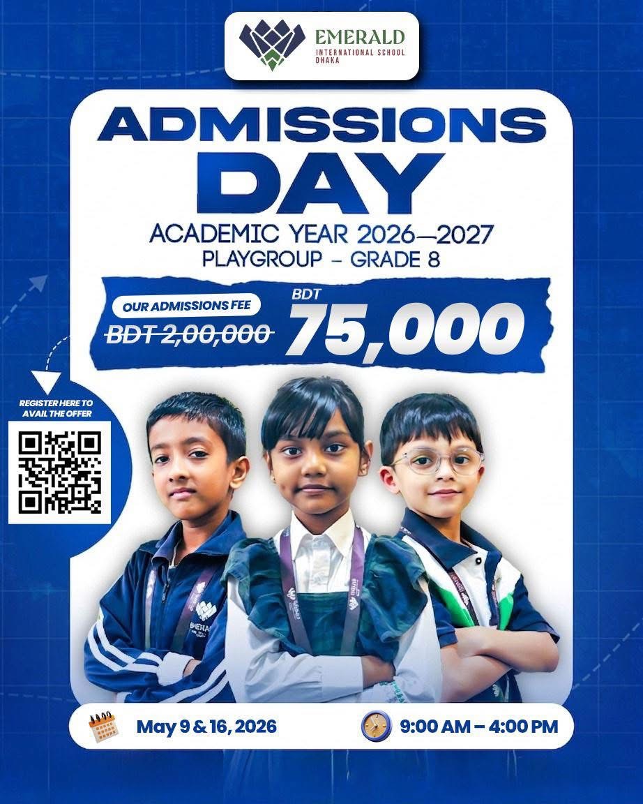 𝐀𝐝𝐦𝐢𝐬𝐬𝐢𝐨𝐧𝐬 𝐃𝐚𝐲 at Emerald International School Dhaka! Discover your child’s future with us as we raise a generation of confident Muslims. Enroll on the spot and unlock amazing opportunities! Join us on 𝐒𝐚𝐭𝐮𝐫𝐝𝐚𝐲𝐬, 𝐌𝐚𝐲 𝟗 & 𝟏𝟔, 𝟐𝟎𝟐𝟔, 𝐟𝐫𝐨𝐦 𝟗:𝟎𝟎 𝐀𝐌 𝐭𝐨 𝟒:𝟎𝟎 𝐏𝐌 Meet the Founder & Chief Advisor in person On-s , … - 27𝐀𝐝𝐦𝐢𝐬𝐬𝐢𝐨𝐧𝐬 𝐃𝐚𝐲 at Emerald International School Dhaka!All Day